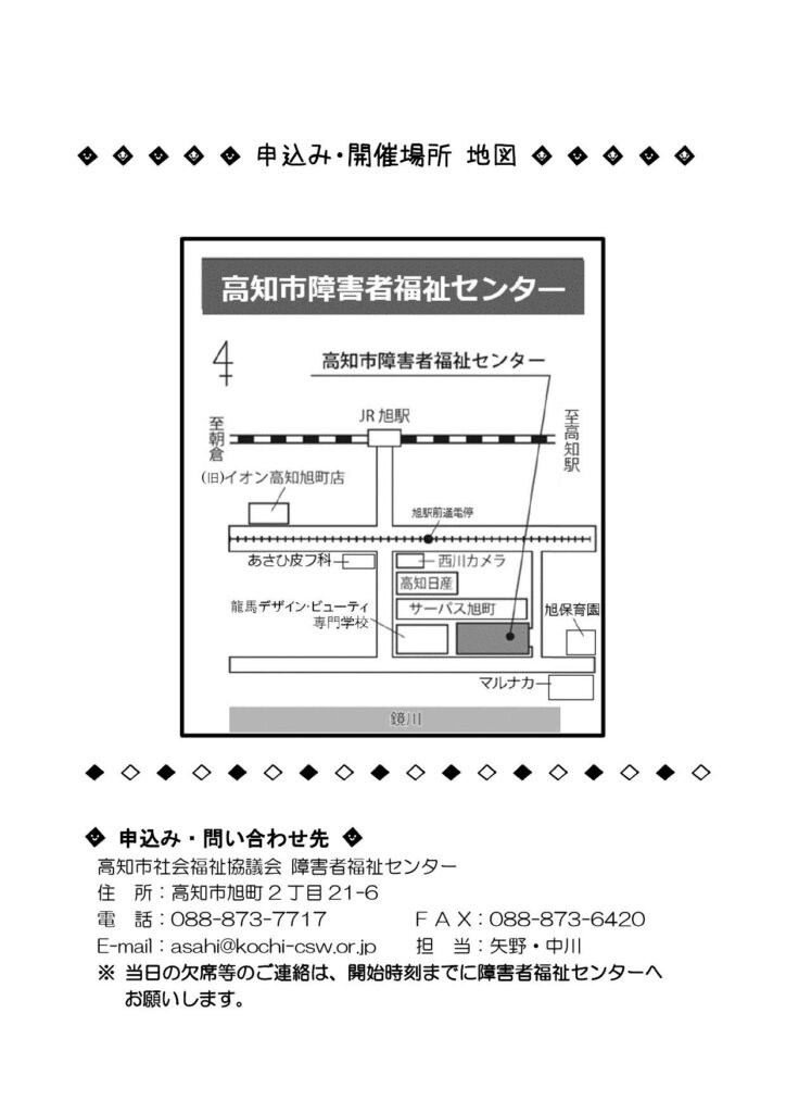 【申込方法】電話、FAX、メールまたは高知市障害者福祉センター2階事務室へ直接。